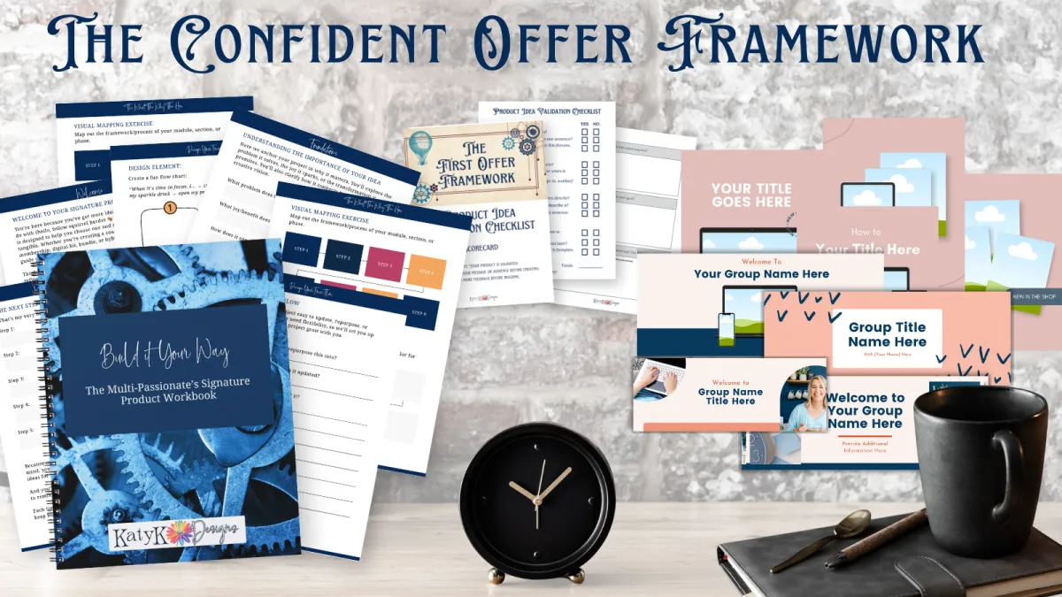 The Confident Offer Builder Framework pulls together everything I wish I’d had when I started: the worksheets, the prompts, the marketing assets — all in one place, simple and doable.